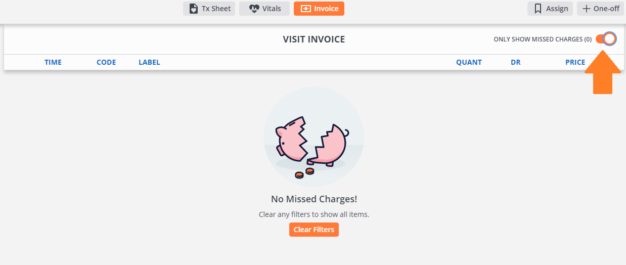 Simply teach your front desk team to head to the Invoice and press the “Only Show Missed Charges” toggle.
